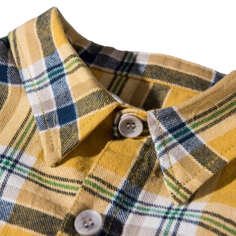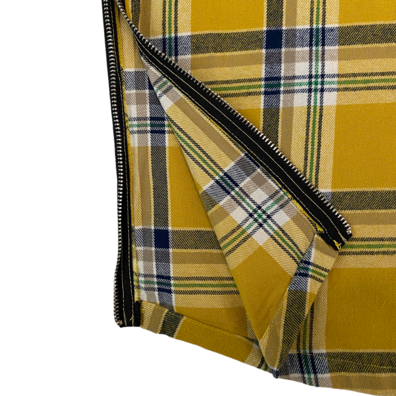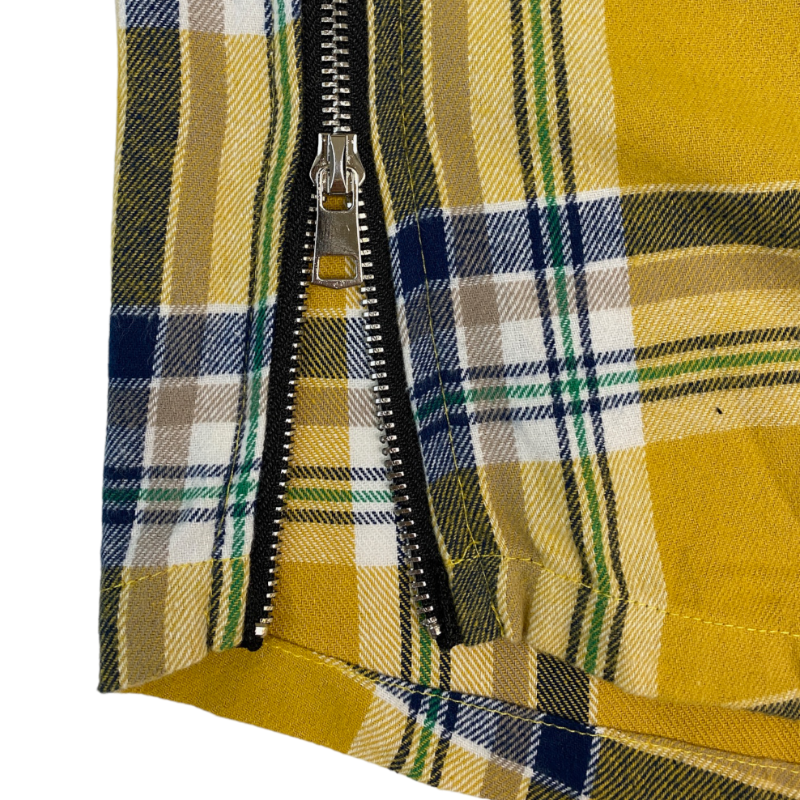Oversized button front plaid shirt. Button down collar. Raw edge frayed armhole. Zipper on side seams at the hem. Two bias cut chest pockets. Soft and brushed with a peached hand. Cotton polyester yarn dye flannel - FINAL SALE. NO RETURN