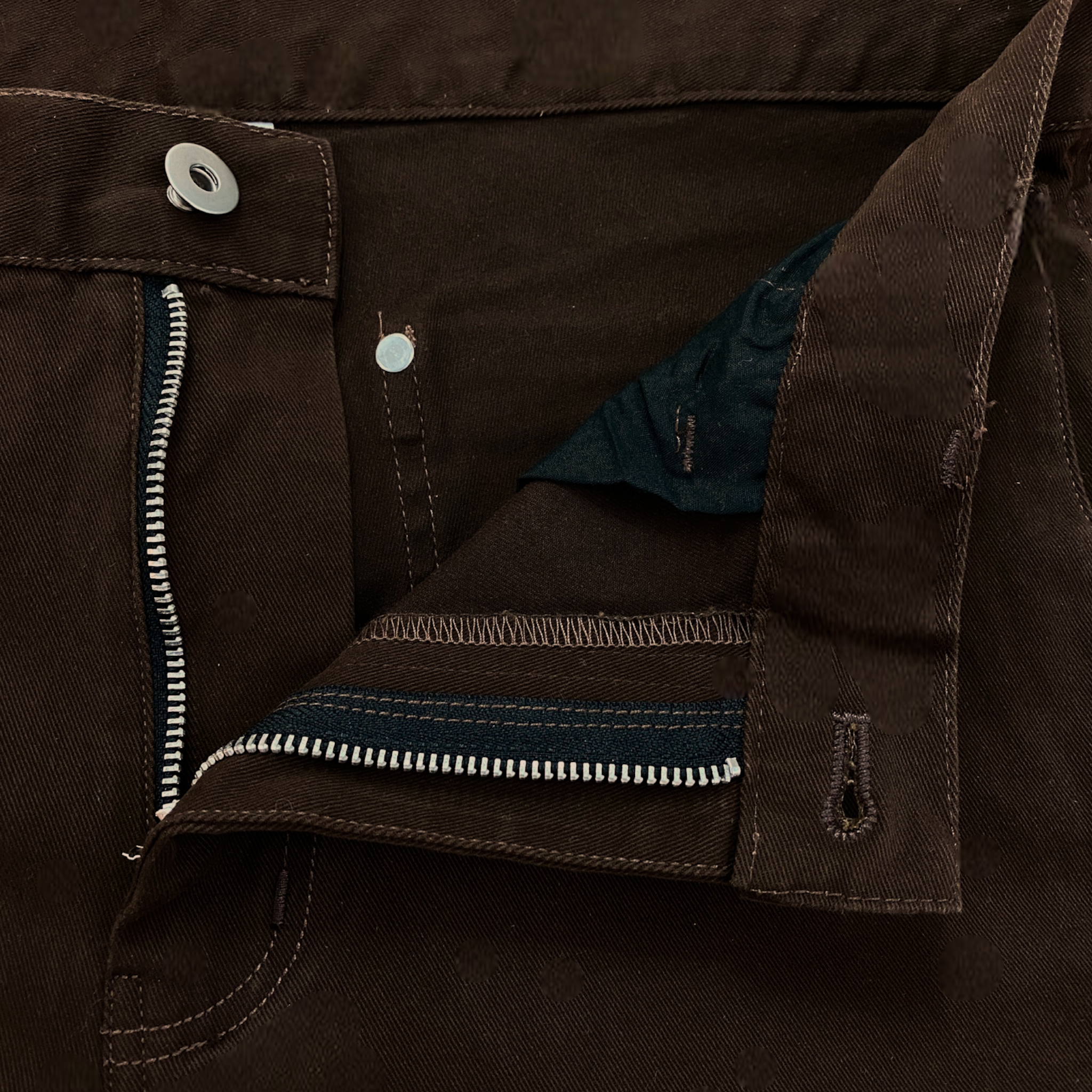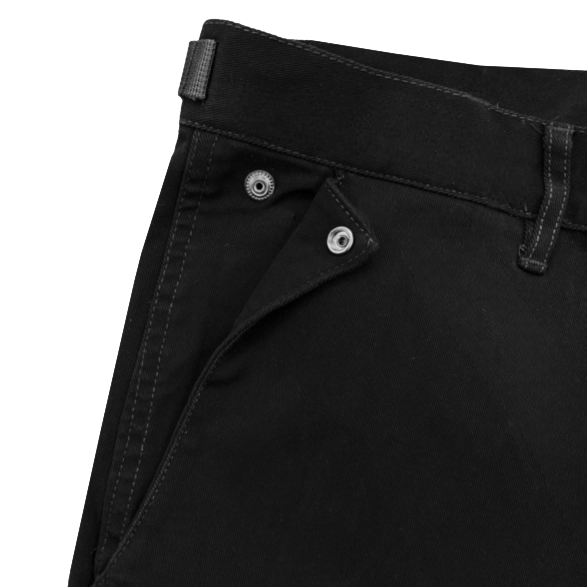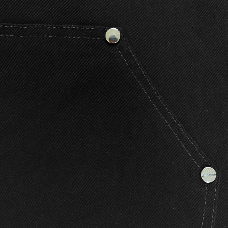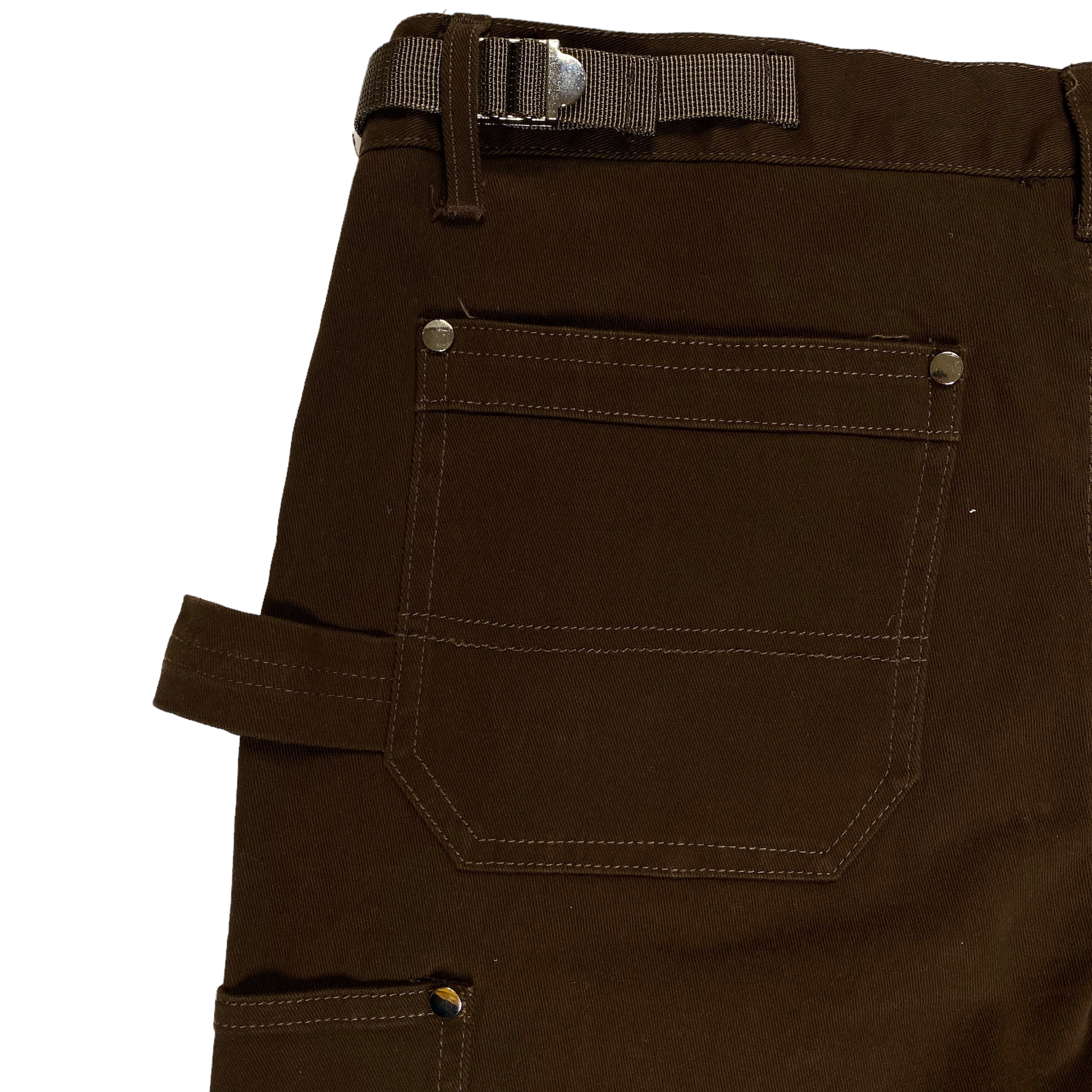 Slim fit flare leg cotton carpenter denim jeans. Snap front waistband. Rivet and seaming details. Side waist with adjustable tab. Zip fly with button waist. Back patch pockets with rivet details. Cotton spandex denim provides stretch.