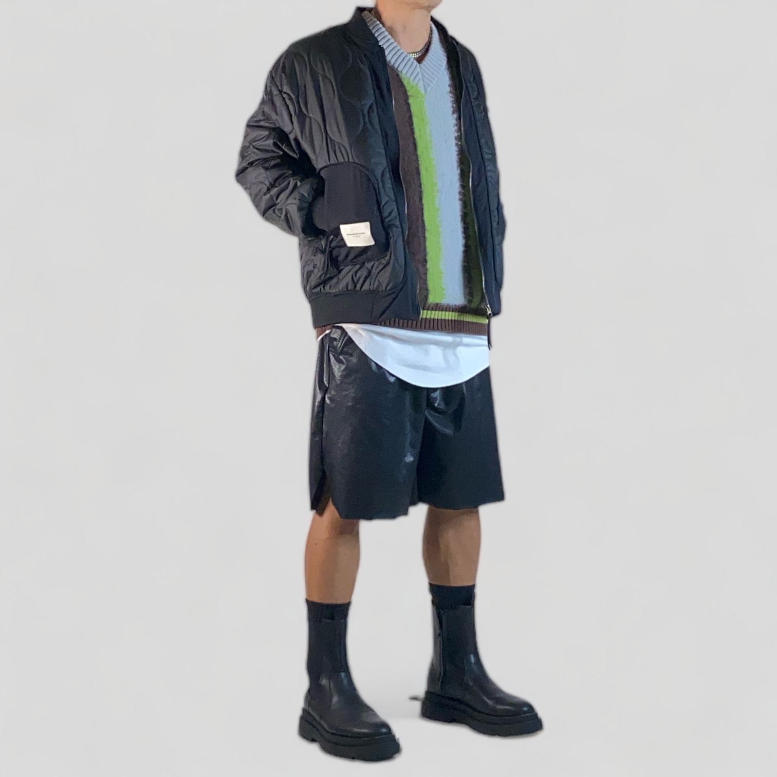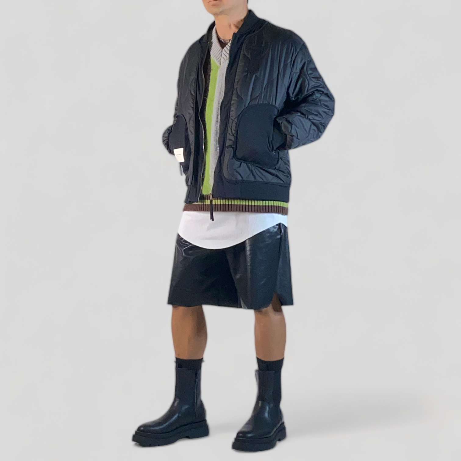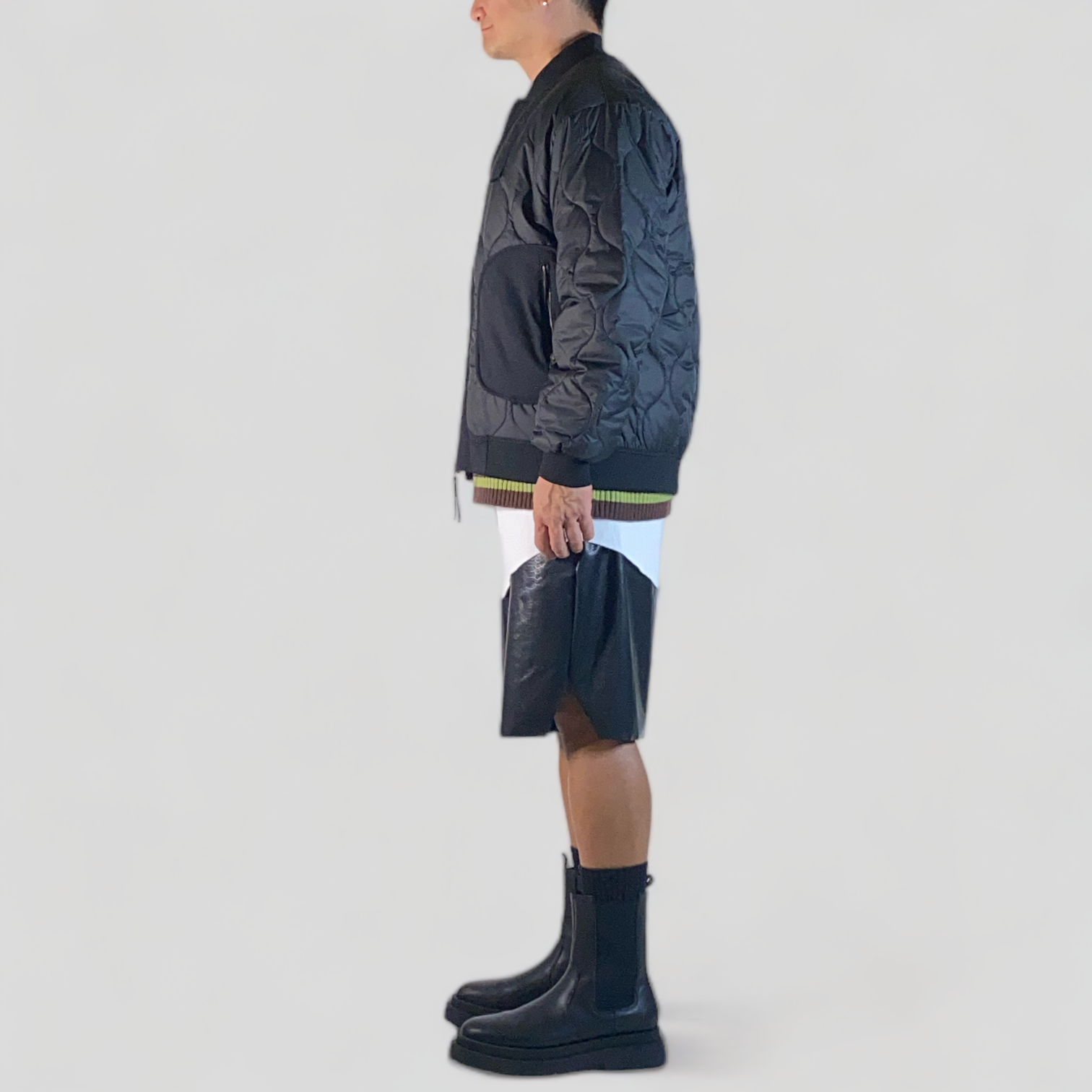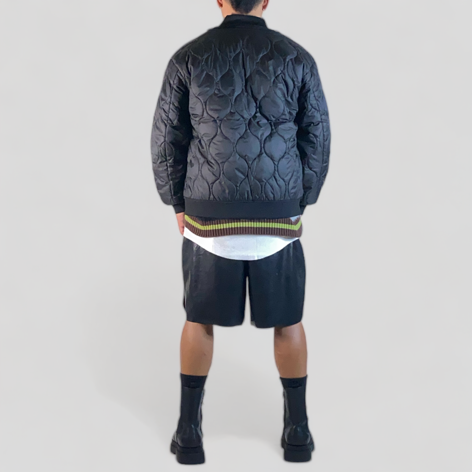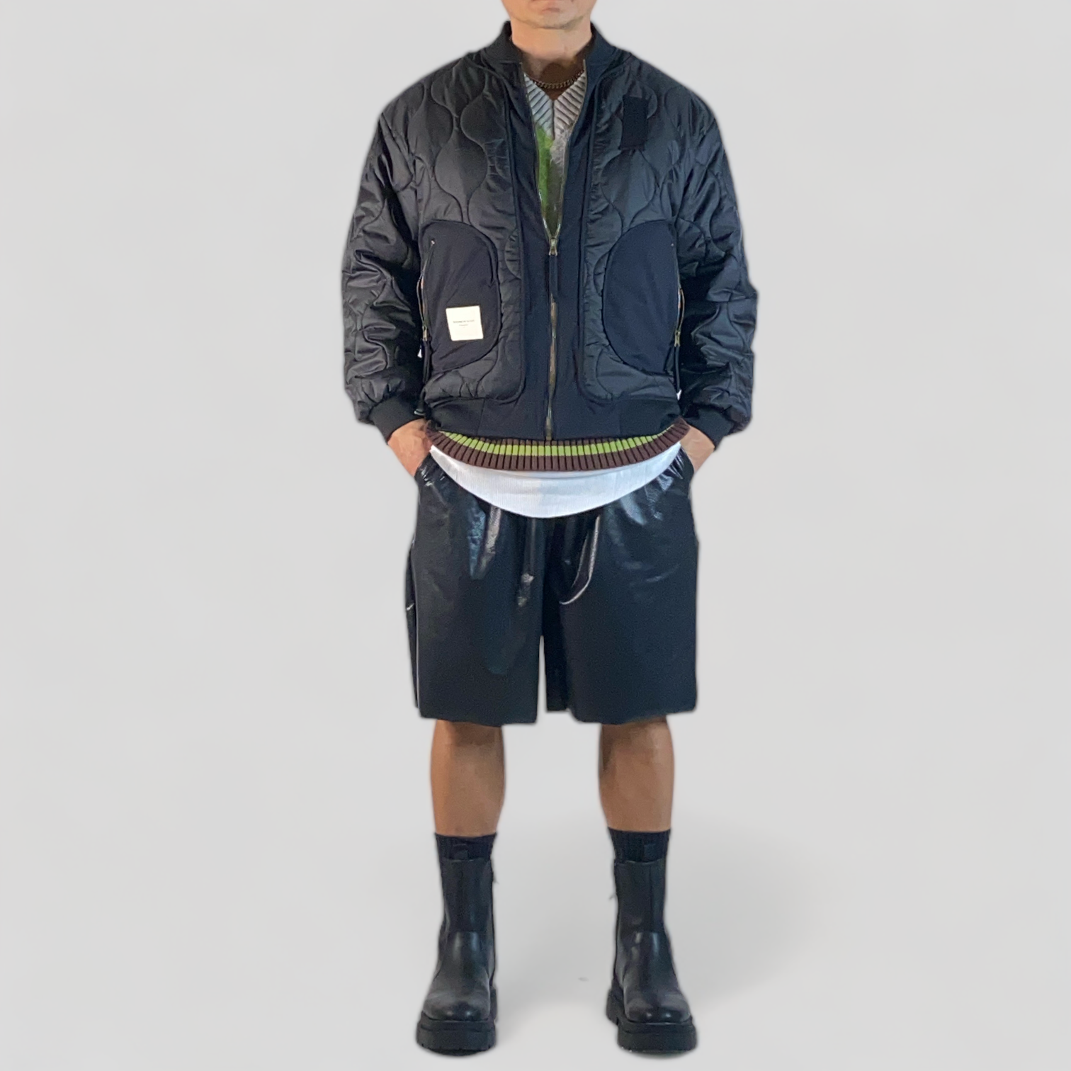 Boxy fit quilted baseball style jacket with dropped shoulder. Rib trimmed collar, cuff and bottom hem. Two front contrast patch pockets with zipper closures. Zipper front with contrast panels. Inside pocket with lining. Cotton polyester batting. 100% polyester shell. AVAILABLE FOR US DELIVERY ONLY.